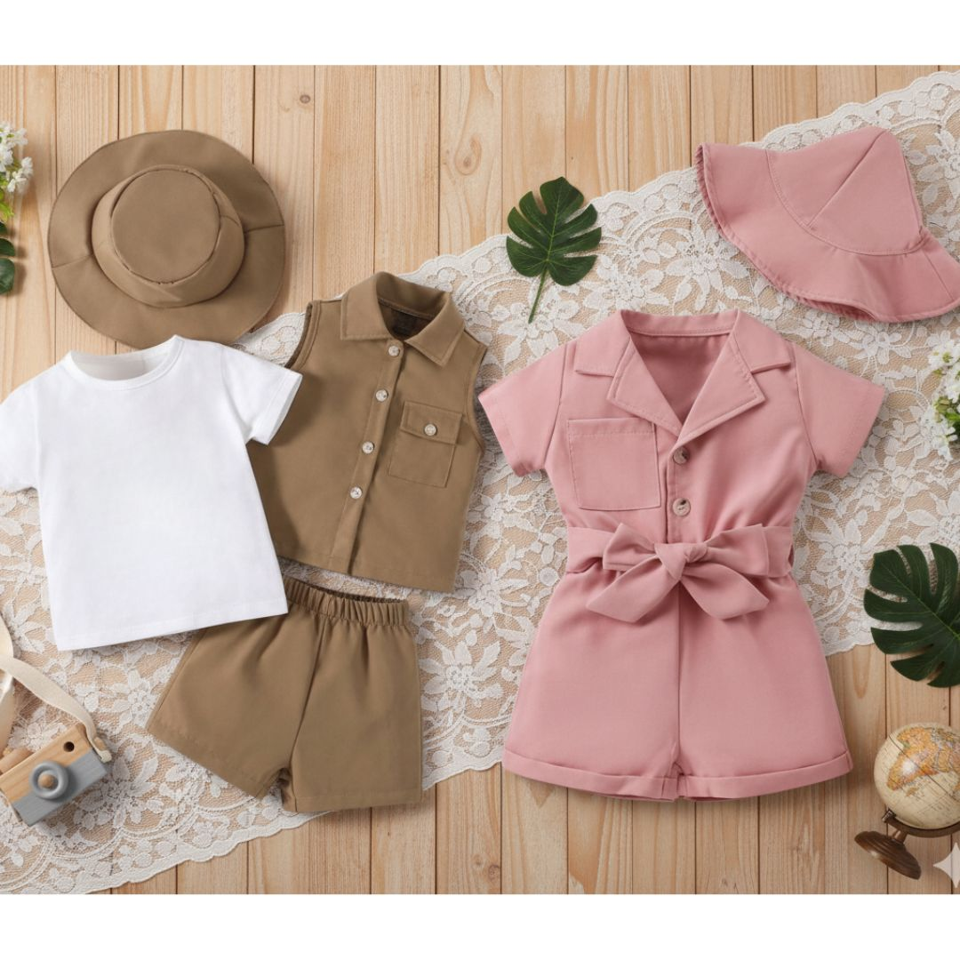 Comprando este kit você receberá a modelagem do conjunto com camiseta, colete, bermuda, chapéu e também do macacão feminino com chapéu.